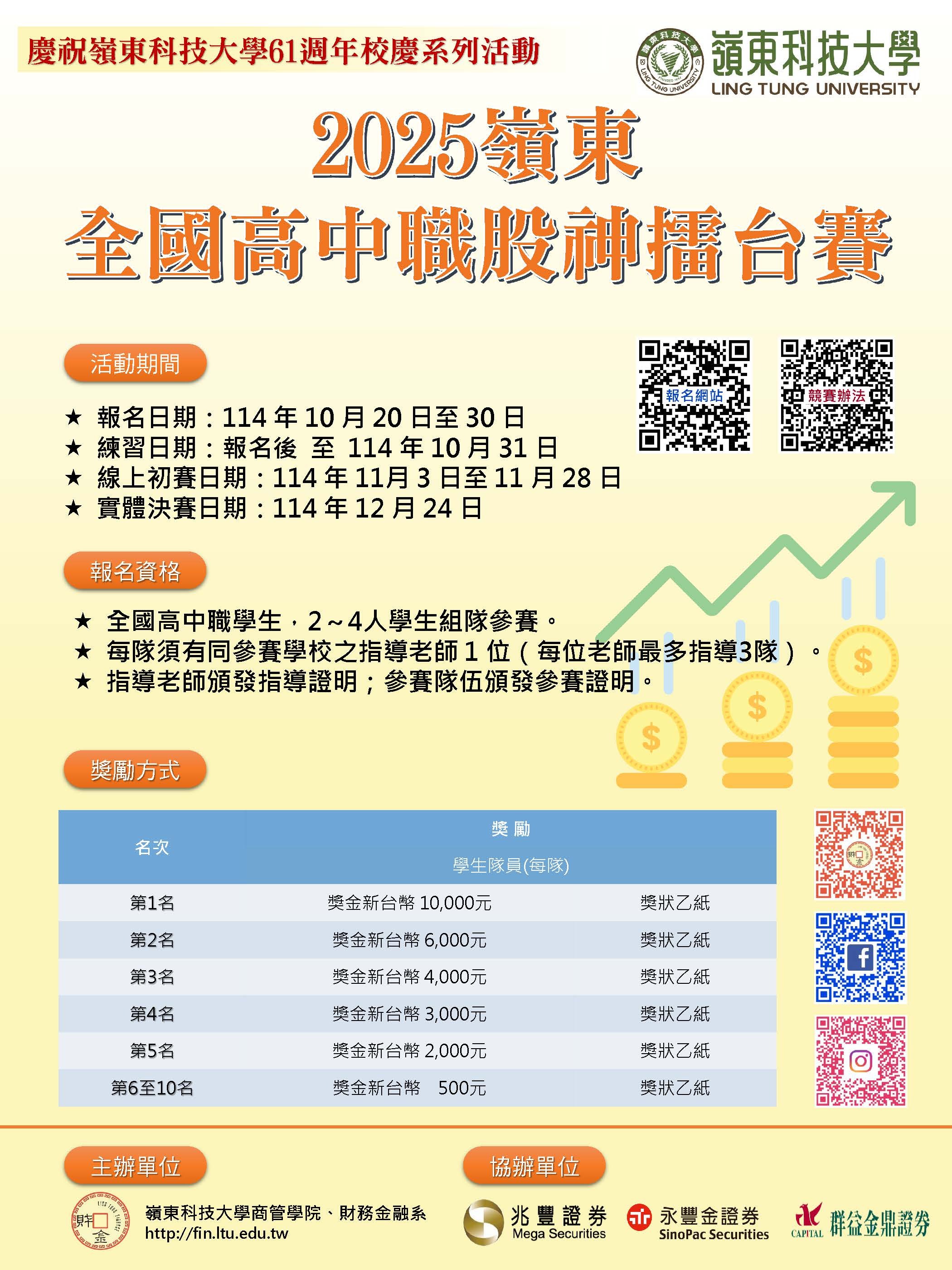 因應教育部大力推廣校園金融教育,本系為實現金融知識普及化與理財教育向下扎根的願景,特別主辦「2025嶺東全國高中職股神擂台賽」。高中職學生透過模擬投資操作,深入學習股票市場的基礎知識、技術分析方法與投資策略規劃,進而增進對金融市場的整體認知,並有效培養個人理財能力。點燃高中職學生對金融領域的學習熱忱,使其體認投資理財是一項需要持續學習與長期發展的專業技能。