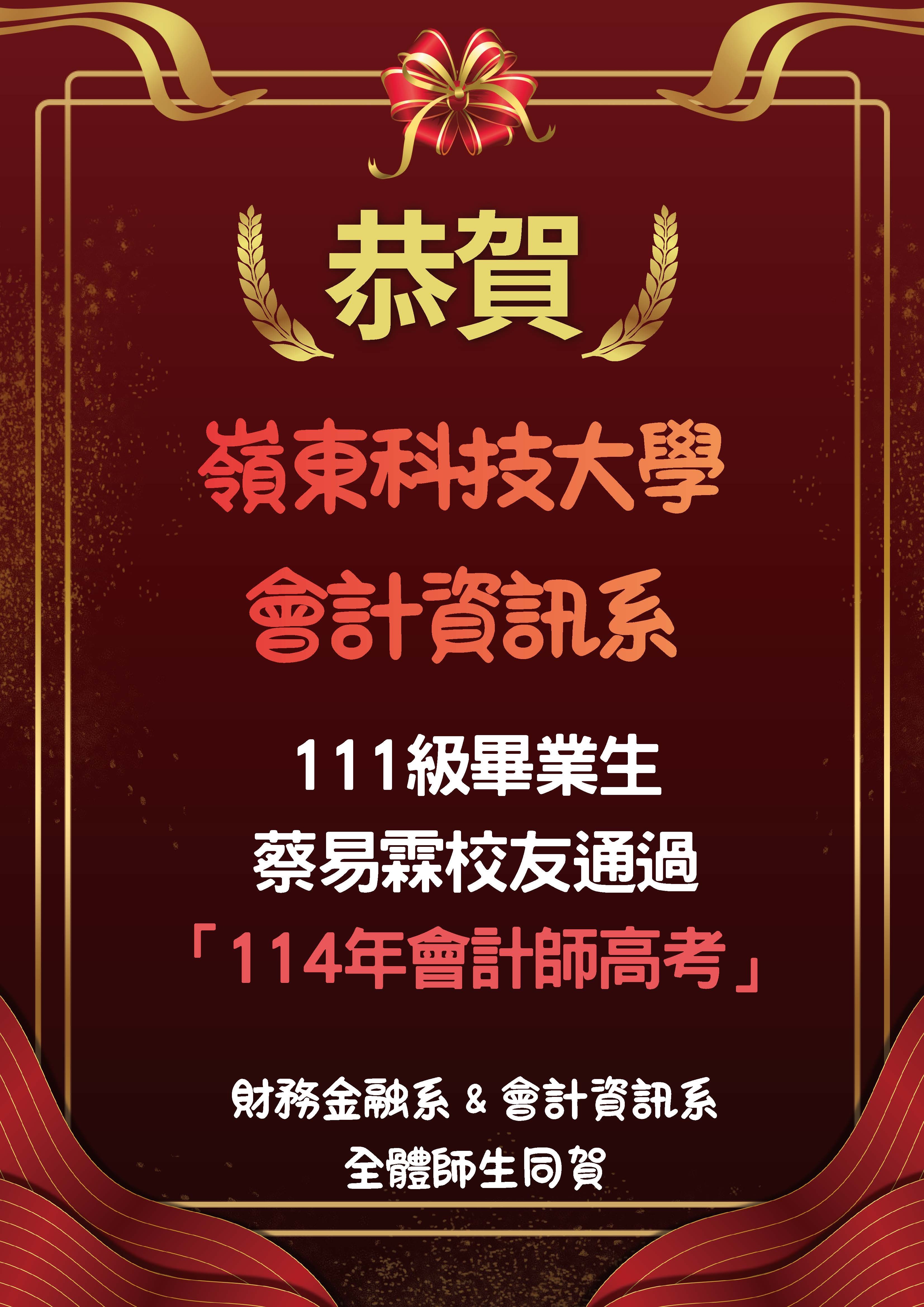 狂賀!!🎉 本校會計資訊系 111 級畢業校友蔡易霖通過 114 年專門職業及技術人員高等考試, 順利取得【會計師】專業資格。